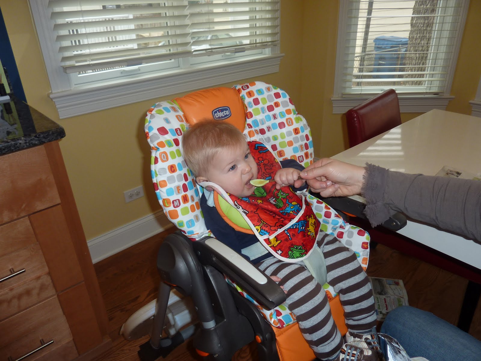 Duncan is getting pretty good with his baby food, eating 3 small servings each day. He really likes to help with the feedings by grabbing the spoon!